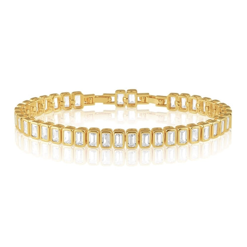 This charming piece showcases dazzling rectangular CZ stones set on lush 18k gold plating. It stretches up to 7 1/2" and includes an adjustable clasp so you can customize the fit just right. Durable, water-resistant, and resistant to tarnish, it’s built to keep sparkling through every adventure.