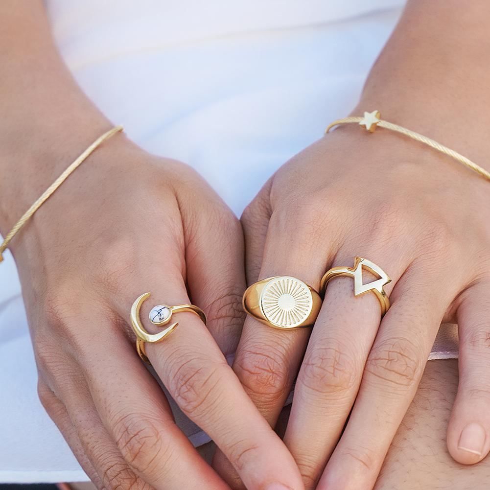 Channel golden hour energy with this stunning Gold Halo Ring. Featuring a radiant sunburst design etched into a smooth gold dome, this piece is a fresh take on the classic signet ring. Bold yet refined, it adds an effortless glow to any outfit—perfect for stacking or standing alone as your signature piece.