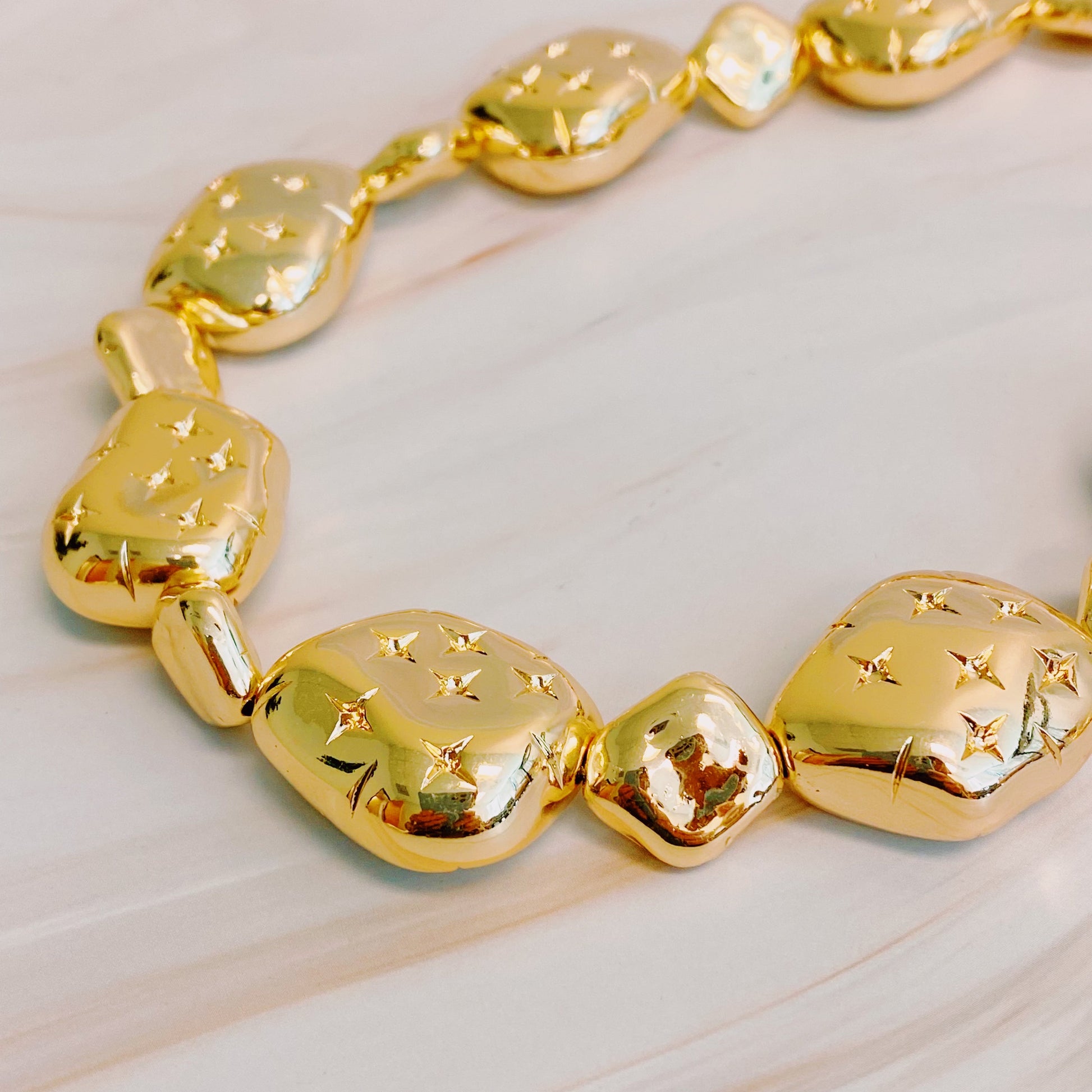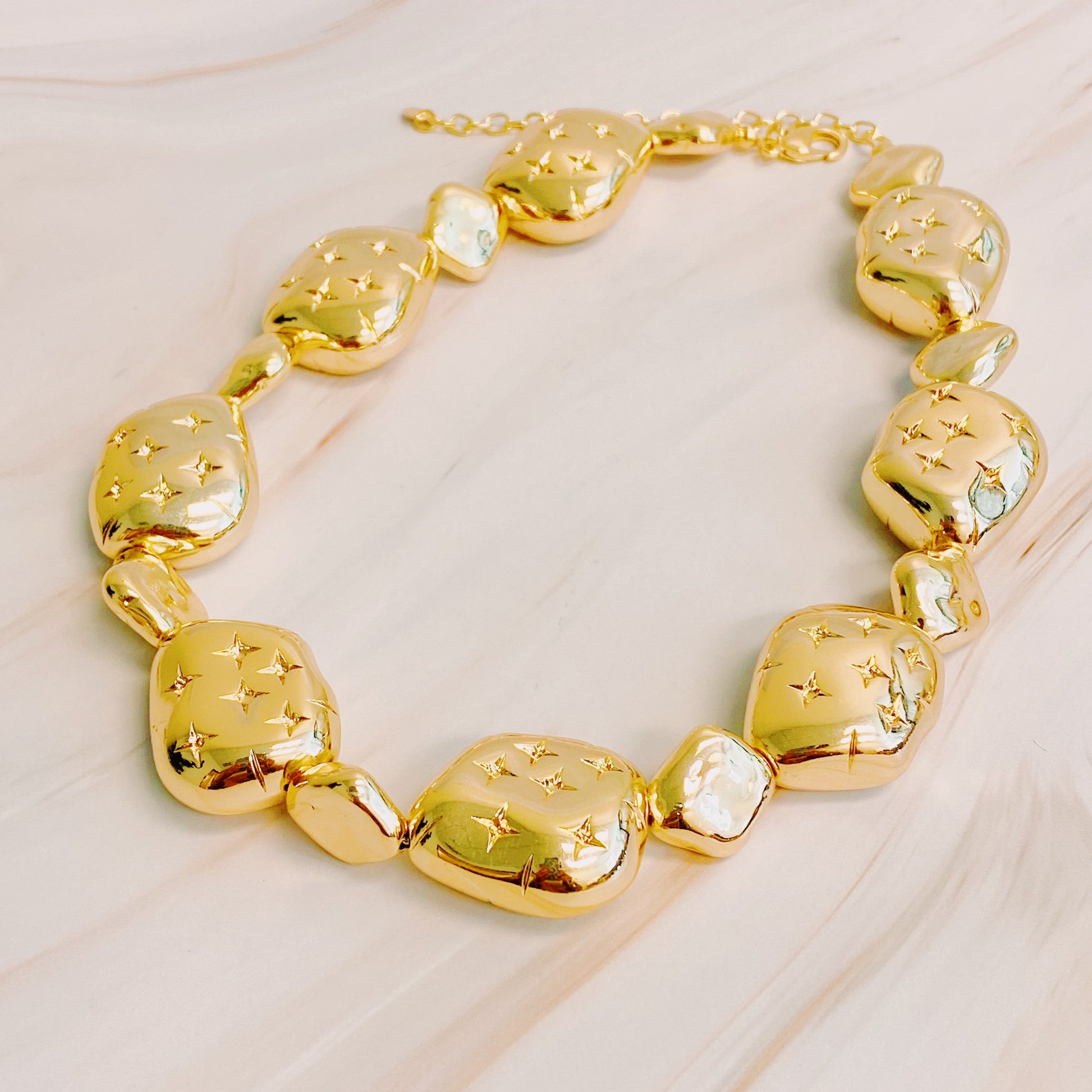 Make a bold statement with our Starlight Golden Pebble Necklace. Crafted with a simplistic design, this necklace adds a touch of glam to any outfit. Its gold color radiates confidence and style.
